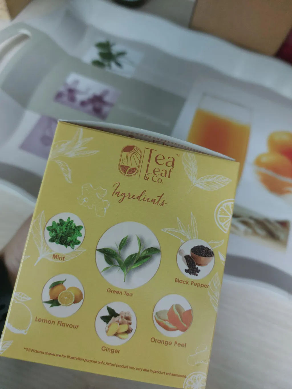 - Green Tea, Lemon extract, Orange peel, Ginger, Mint, and Black pepper